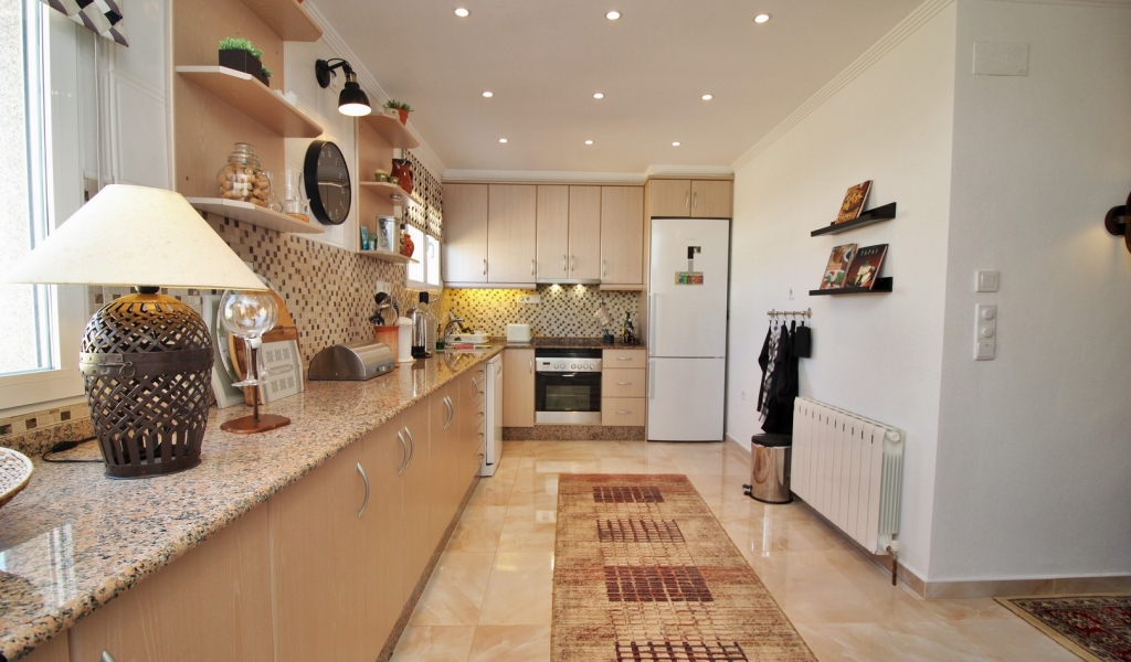 Practical features abound, including a garage with an electric door, workshop, a storage room, and energy-efficient solar panels. The large plot provides ample outdoor space for gardening or alfresco dining in the summer kitchen. Sold fully furnished with white goods.