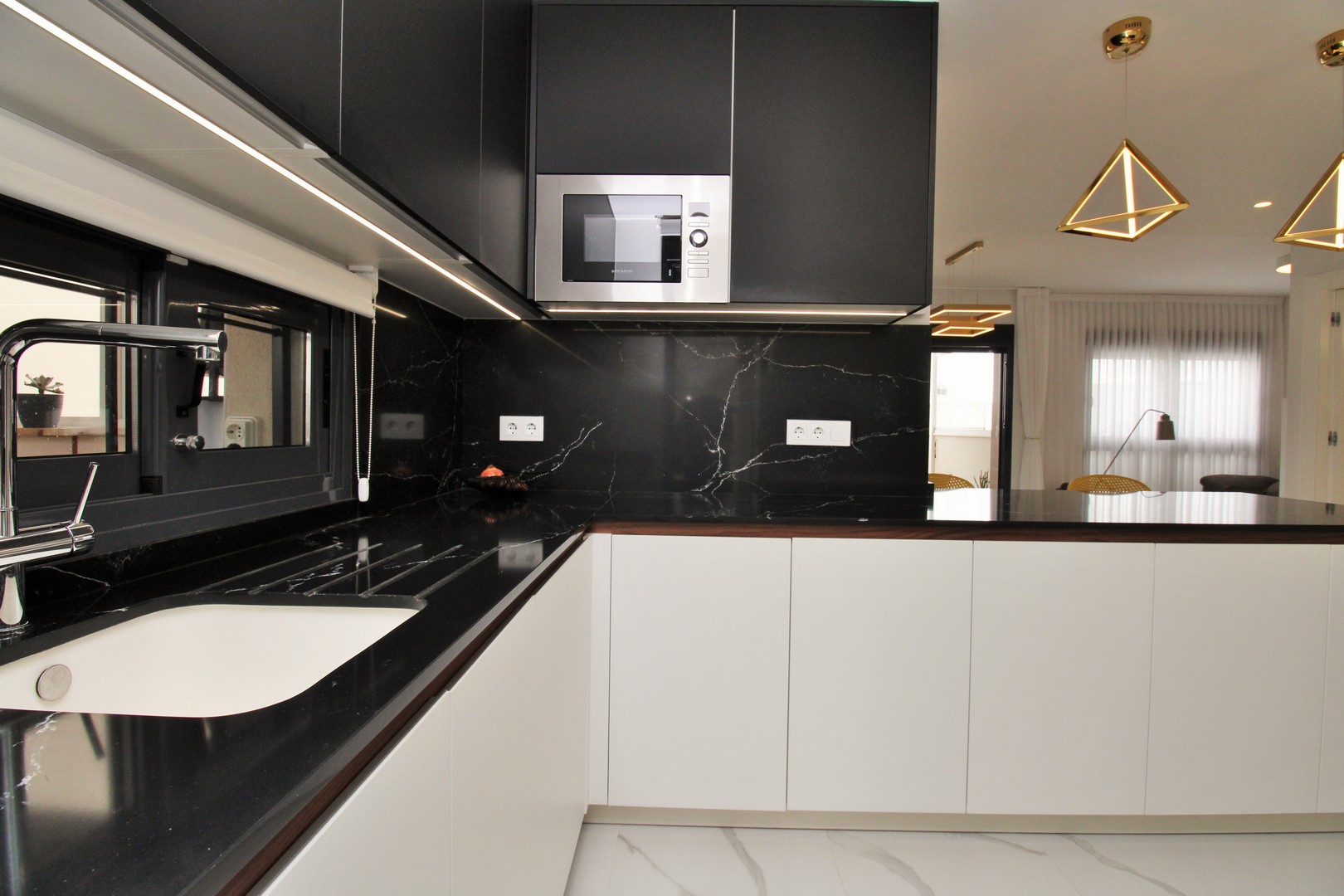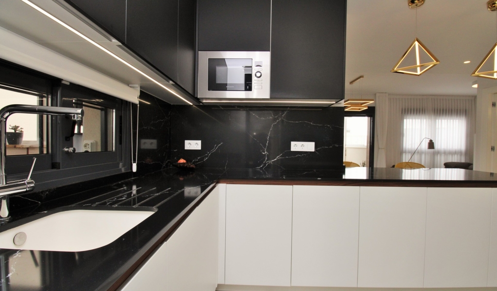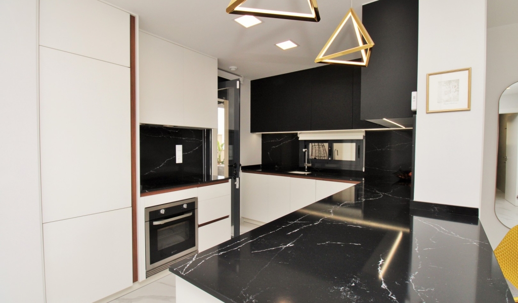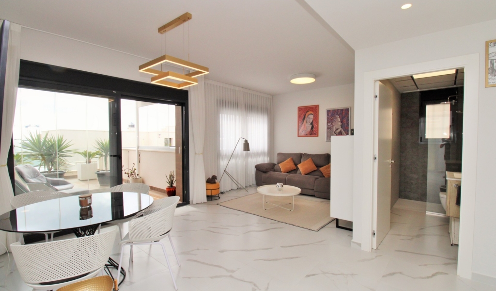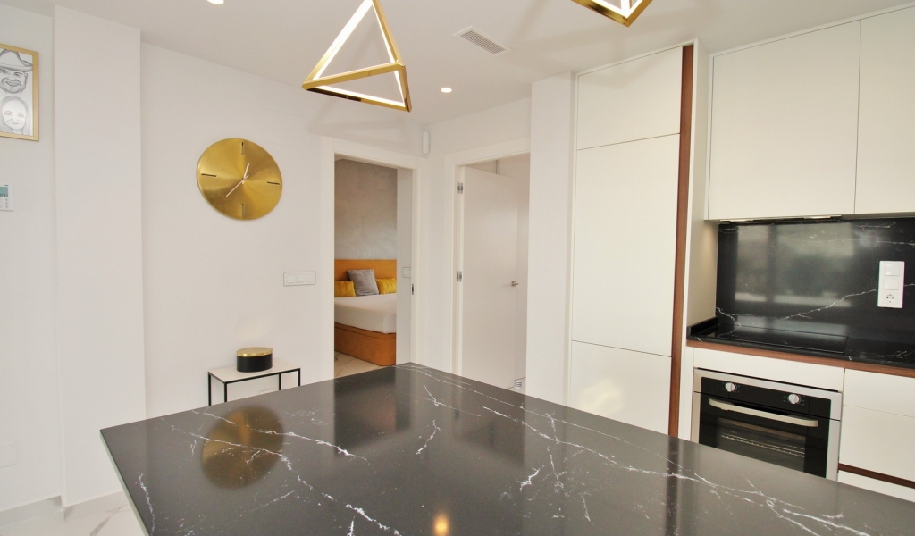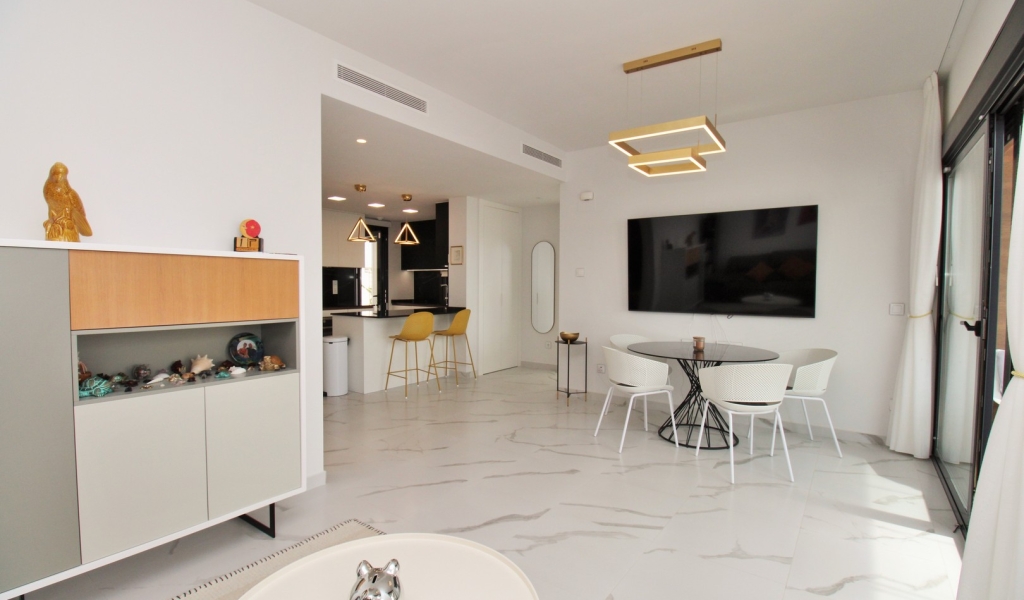 The apartment offers a bright and spacious open-plan layout, with marble flooring throughout, a contemporary fitted kitchen, and a comfortable lounge-dining area that flows directly out to the terrace — perfect for enjoying the Costa Blanca sunshine.