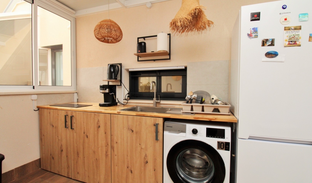 The master bedroom includes an en-suite bathroom, while both bedrooms are well-proportioned and finished to a high standard. Outside, the property really shines, featuring a sunny terrace with sea and salt-lake views, and a fantastic summer kitchen area ideal for outdoor dining and entertaining.