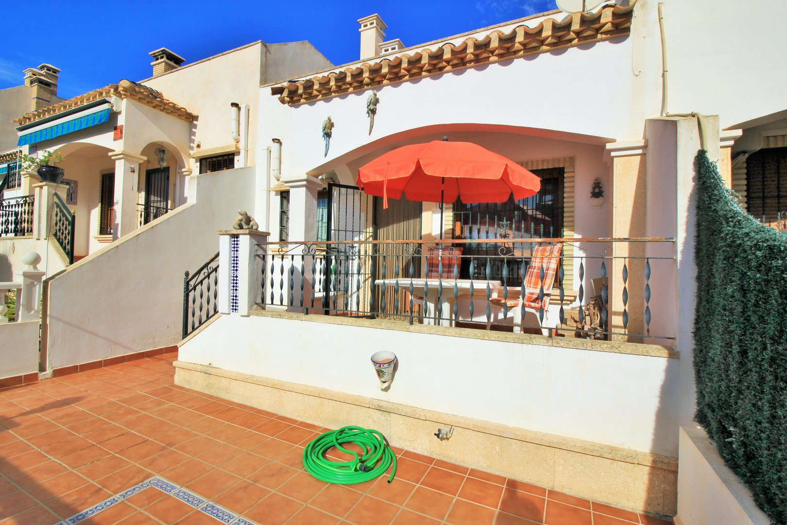 The living accommodation on the ground floor comprises of a spacious lounge-dining area with open kitchen plus utility area to the side, 2 bedroom with fitted wardrobes to the rear, and a family bathroom. French doors from one of the downstairs bedrooms leads out onto the rear tiled garden with plenty of space to entertain and dine on. To the front of the property is a tiled garden with a raised covered terrace. Upstairs you will find the master bedroom with high ceilings, which offers its own en-suite bathroom with walk-in shower, plus lots of storage space inside the built-in storage room. There is a large roof solarium accessible from the master bedroom and the landing, which enjoys plenty of sunshine throughout the day. Part of a community with the use of a communal pool just a few steps away. All houses on the community are currently undergoing repainting.