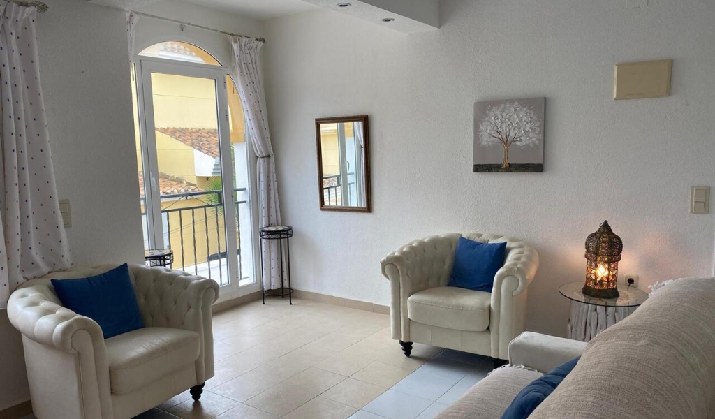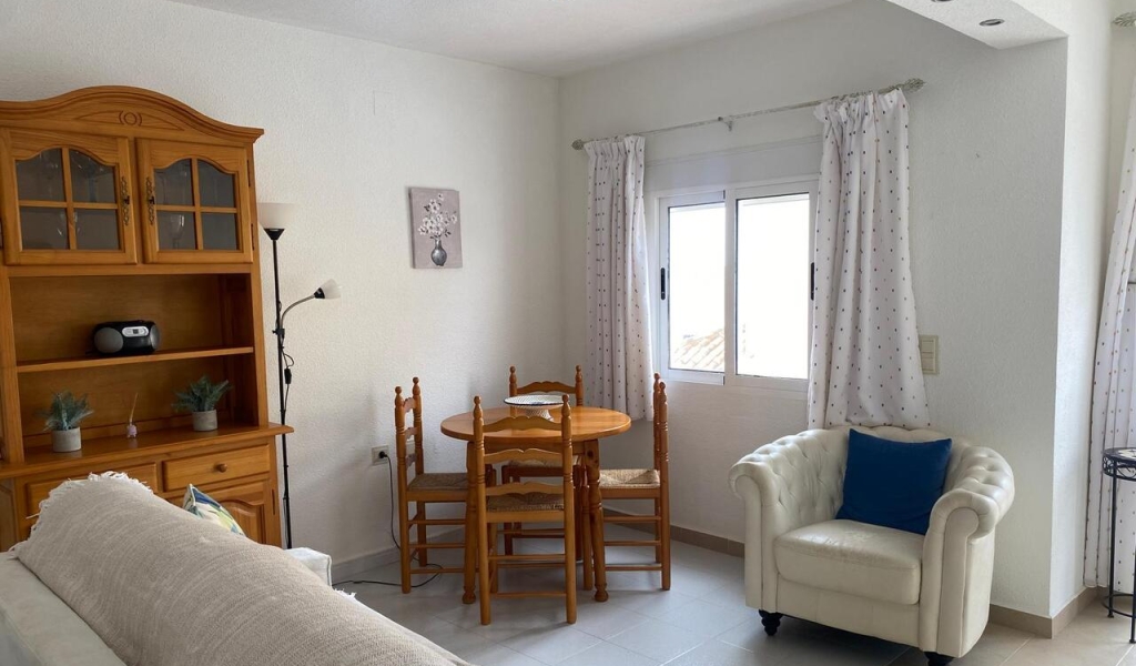 We are pleased to present this 1 bedroom top floor apartment located in the highly popular gated community of Las Carolinas, El Galan in Villamartin. The apartment is situated inside the gated community with communal gardens and pool area. It is 20 minutes walk from the famous Villamartin Plaza and golf course, and a 10 minute walk to the local bars, restaurants and a convenience store. A fantastic bolthole in Spain! The living accommodation comprises of a lounge-dining area with an open plan kitchenette, 1 bedroom with wardrobe area, and an en-suite fully fitted shower room. The apartment is located on the top floor of a block with only 2 floors, ground floor and top floor. The property is to be sold fully furnished with white goods, ready to use from day one.A fantastic opportunity to purchase this wonderfully position apartment, in a well kept quiet community, within walking distance to everything you need. There is also a mini-golf establishment within a few minute’s walk! Viewings highly advised for this great property!El Galan close to the town of Villa Martin. It is within 5 minutes drive of the Campoamor and Las Ramblas Golf courses and less than 5 minutes from Villamartin Golf course and the famous Villamartin Plaza centre with over 35 restaurants. Within a few minute’s drive of the apartment there are ample selection of bars, restaurants, supermarkets, banks and specialist shops. The nearest beaches are a 7 minute drive and many more a little further. The vibrant town of Torrevieja is 15 minutes away and access to the AP7 motorway is 5 minutes and this gives you freedom to explore the whole region. The grand cities of Alicante, Murcia, Elche, and Cartagena are very accessible as well as both the coast and wonderful countryside of the region. The town of San Miguel de Salinas is the nearest town inland from El Galan, which is a short drive through the orange and lemon groves and has some lovely local restaurants situated down the little side streets but the town especially comes alive on market day (Wednesday) with the lovely Spanish residents. This is an area where there is plenty to do for both golfers and non golfers alike, in both areas, with beaches, water sports, Safari Park, horse riding, shopping and general sightseeing all close by. While inland the scenery is breathtakingly beautiful and within moments you can be driving in picturesque open countryside,  where you can stop and pick a fresh orange or lemon and enjoy the fabulous bounty that nature has gifted to this part of the world.