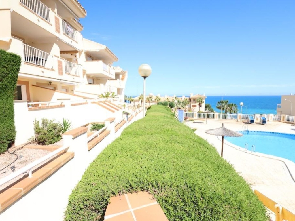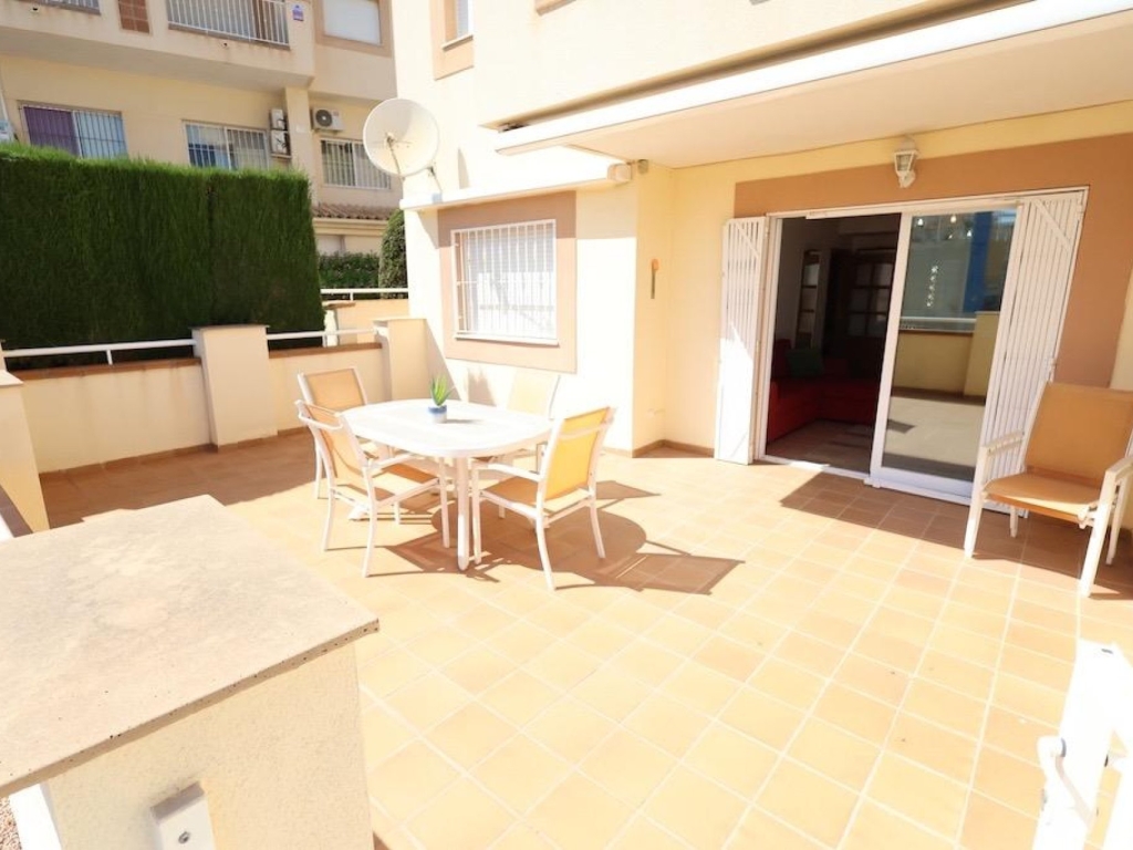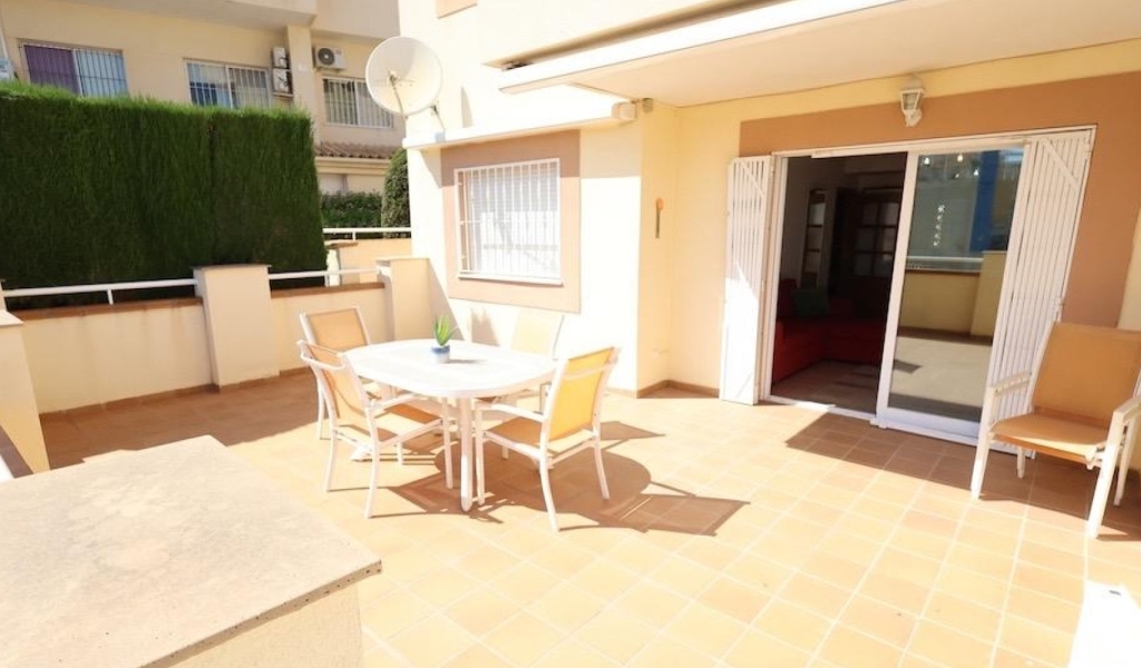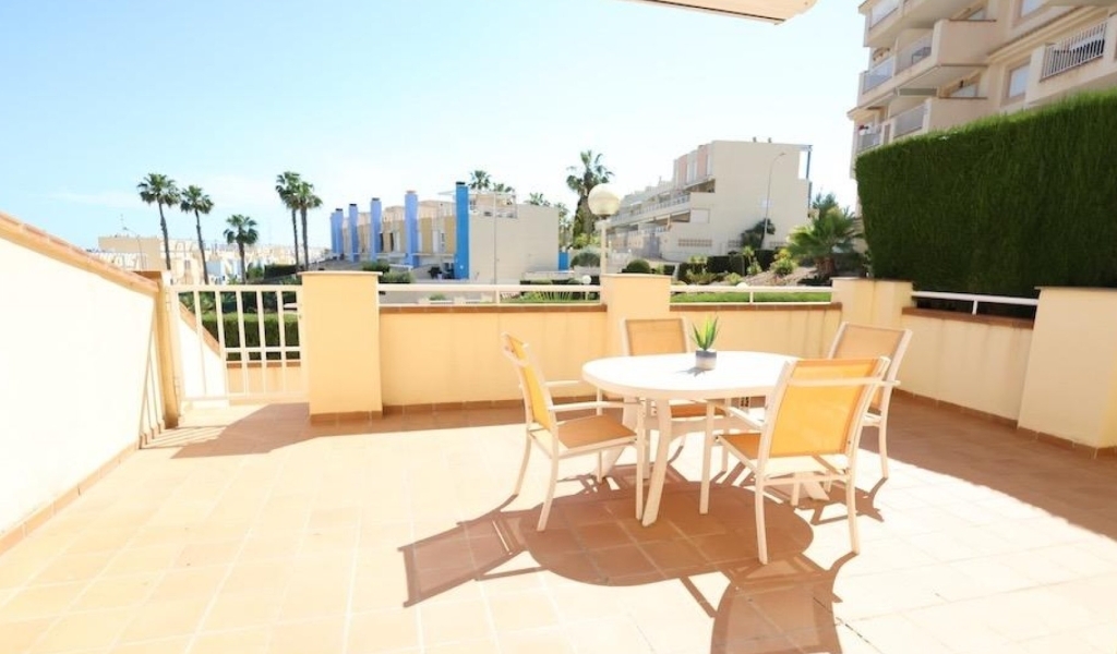 Agua Marina in in stunning location in Campoamor and only a walk of 350m to the beach. Ground floor corner apartment facing south with sea views and facing the communal pool, with a large 20 m² terrace with direct access to the pool.