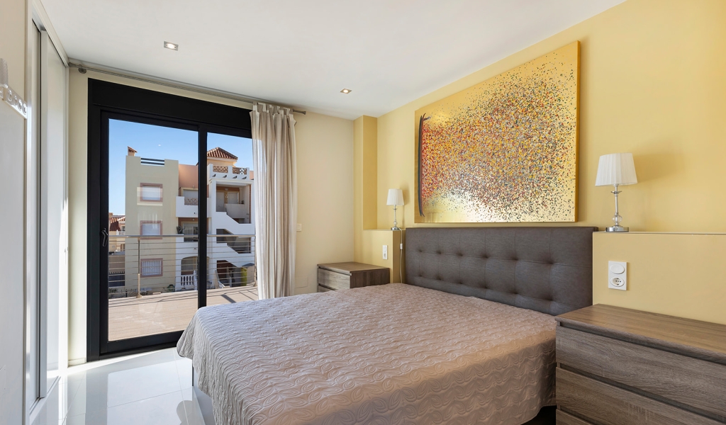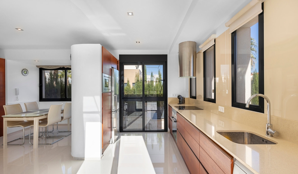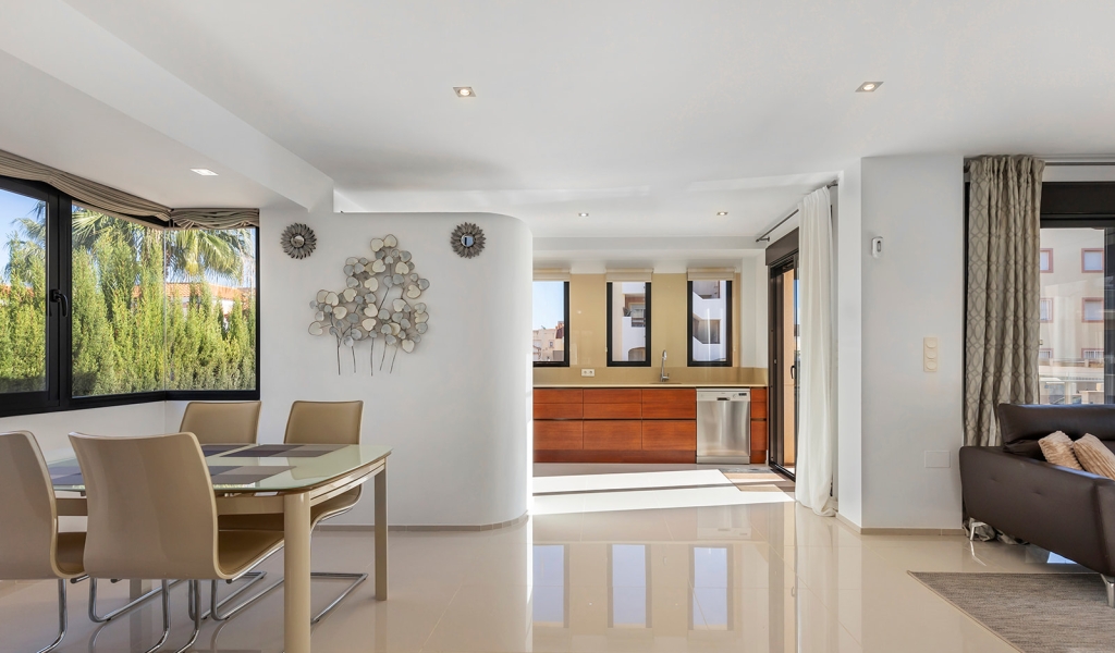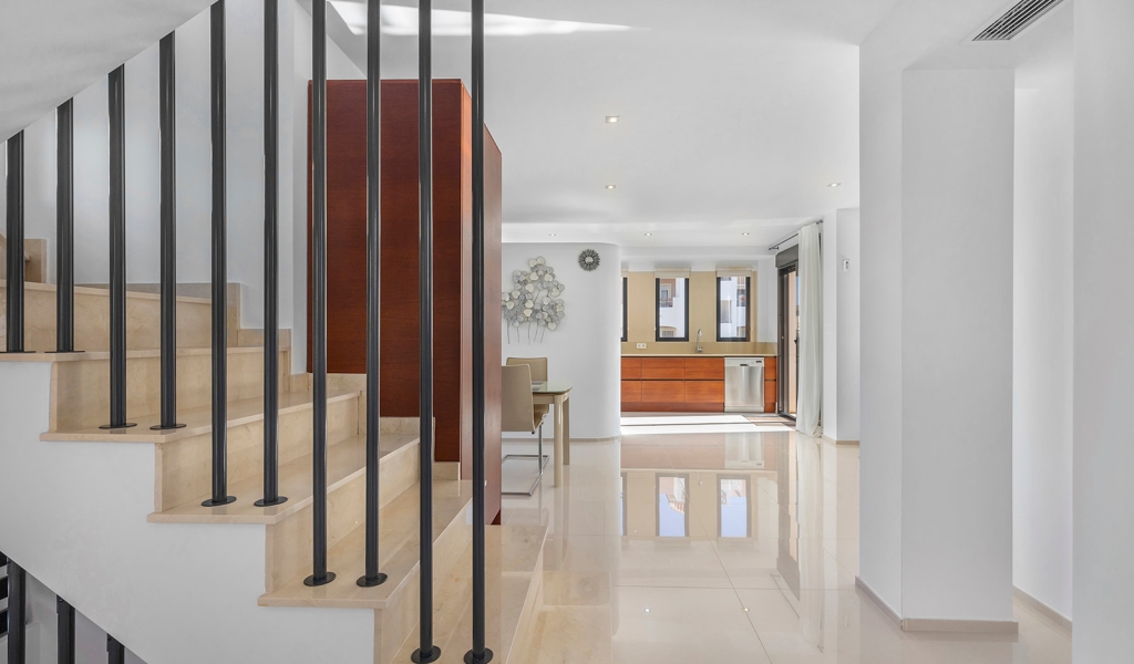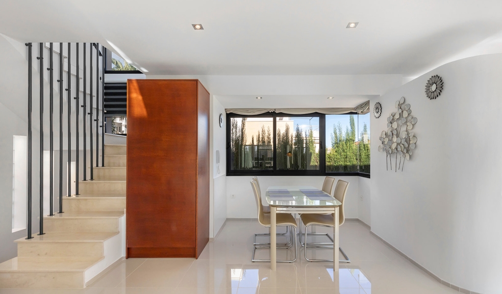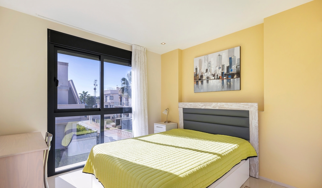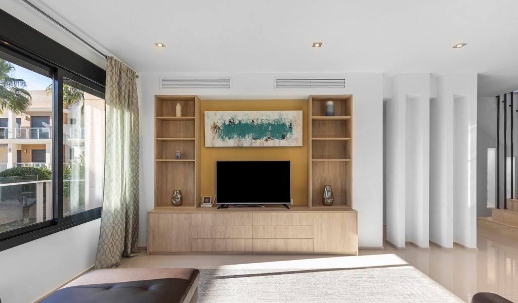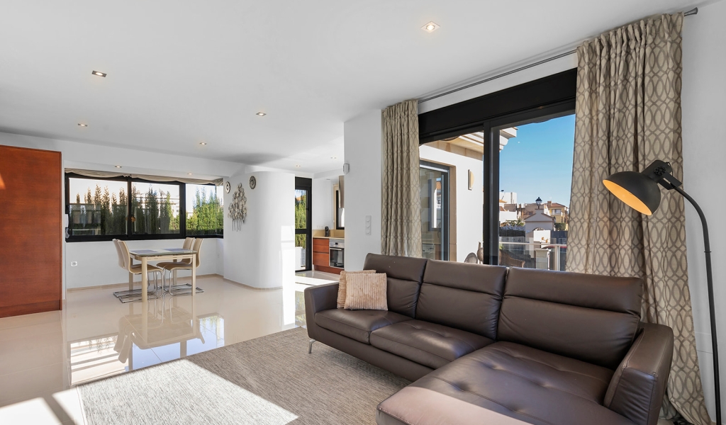 Luxury villa in La Zenia, Orihuela Costa. This villa is situated in an exclusive residential area and has its own private pool and a plot of 410m2. The property has 250m2 built area divided into 4 floors. On the ground floor there is a spacious living room with open plan kitchen, 1 bedroom, 1 bathroom and terrace with access to the pool. On the semi-basement floor there is a living room with open plan kitchen, 2 bedrooms and 1 bathroom. This floor also has a sauna and shower. On the first floor there are 2 bedrooms, each with en-suite bathroom and a large terrace. On the top floor there is a large solarium of 46m2. La Zenia is close to Cabo Roig, Campoamor and Playa Flamenca. It is a tourist area located close to all amenities of the famous La Zenia Boulevard shopping centre. A few minutes from the N-332 and the Mediterranean motorway AP-7 towards Alicante and Cartagena. There are also around the golf courses of Villamartin, Las Ramblas, Campoamor and Las Colinas.