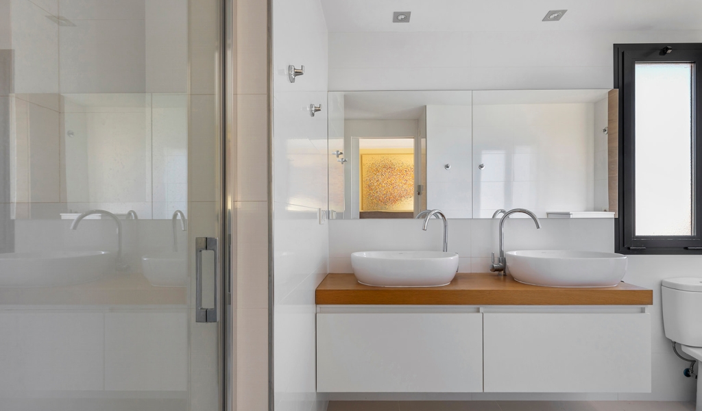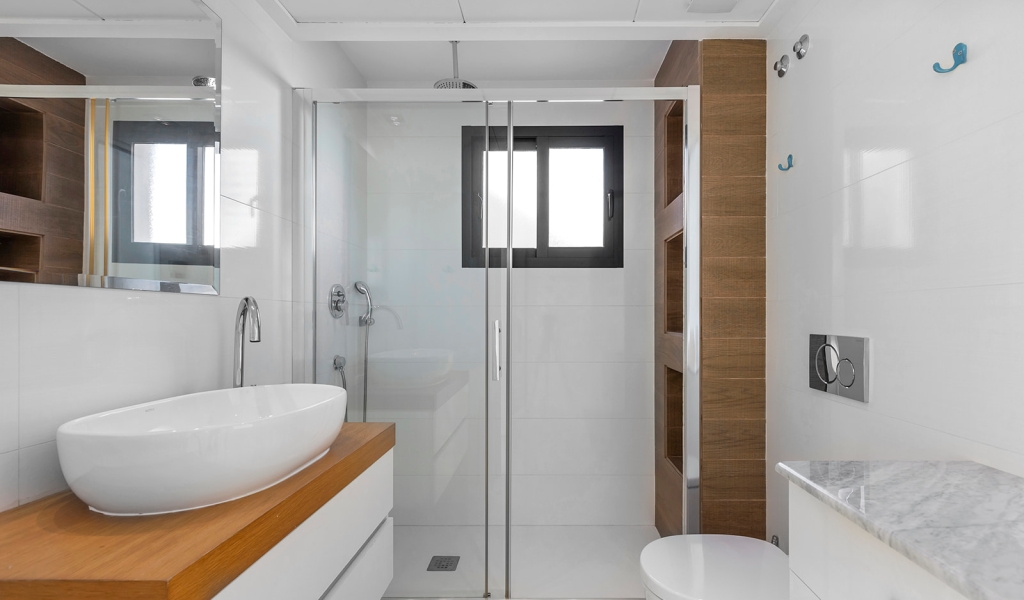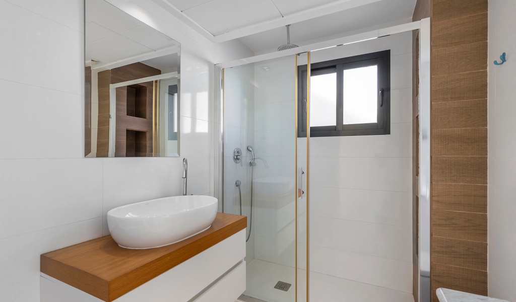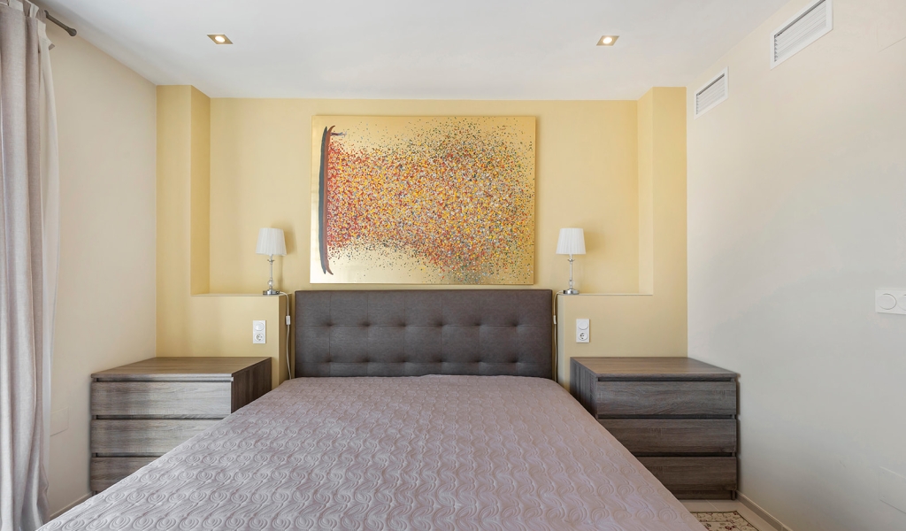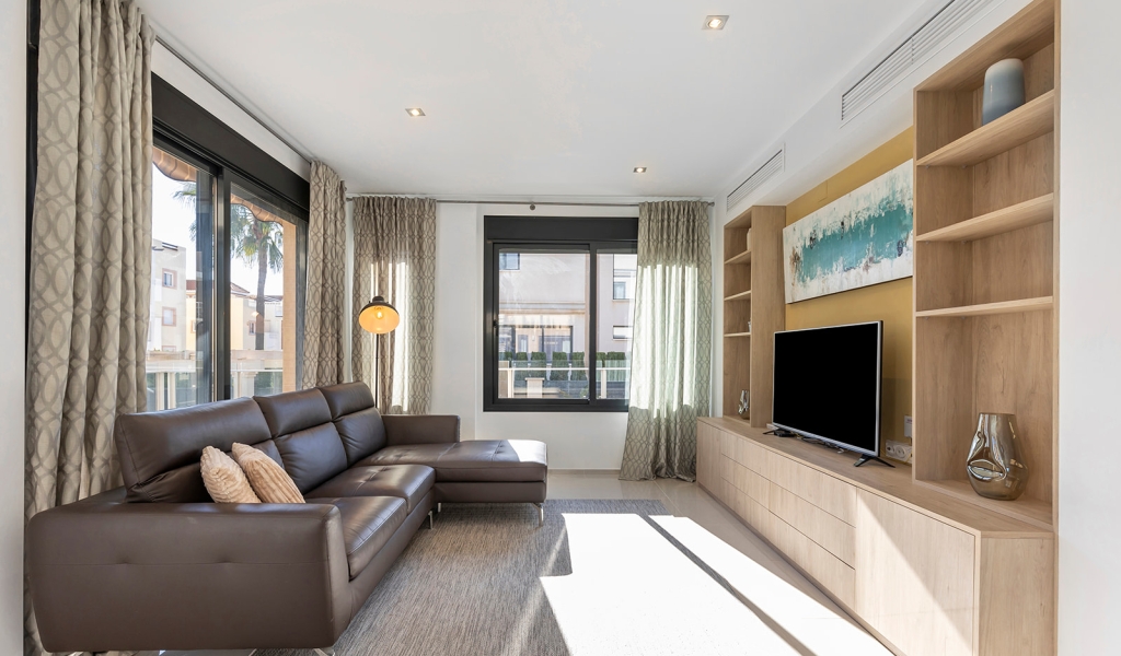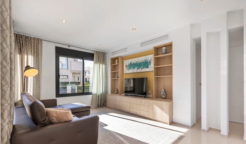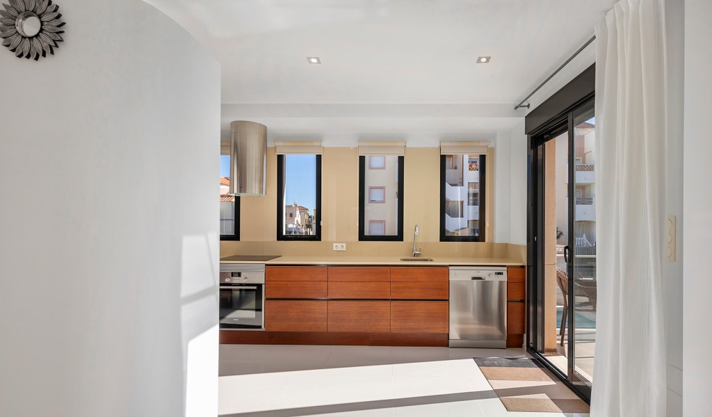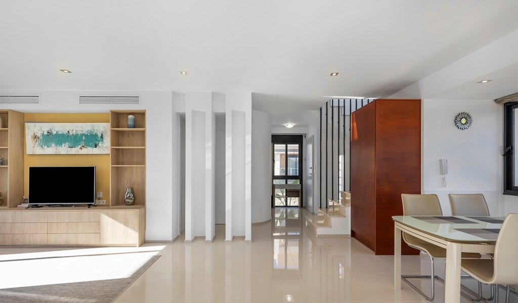 Luxury villa in La Zenia, Orihuela Costa. This villa is situated in an exclusive residential area and has its own private pool and a plot of 410m2. The property has 250m2 built area divided into 4 floors. On the ground floor there is a spacious living room with open plan kitchen, 1 bedroom, 1 bathroom and terrace with access to the pool. On the semi-basement floor there is a living room with open plan kitchen, 2 bedrooms and 1 bathroom. This floor also has a sauna and shower. On the first floor there are 2 bedrooms, each with en-suite bathroom and a large terrace. On the top floor there is a large solarium of 46m2. La Zenia is close to Cabo Roig, Campoamor and Playa Flamenca. It is a tourist area located close to all amenities of the famous La Zenia Boulevard shopping centre. A few minutes from the N-332 and the Mediterranean motorway AP-7 towards Alicante and Cartagena. There are also around the golf courses of Villamartin, Las Ramblas, Campoamor and Las Colinas.