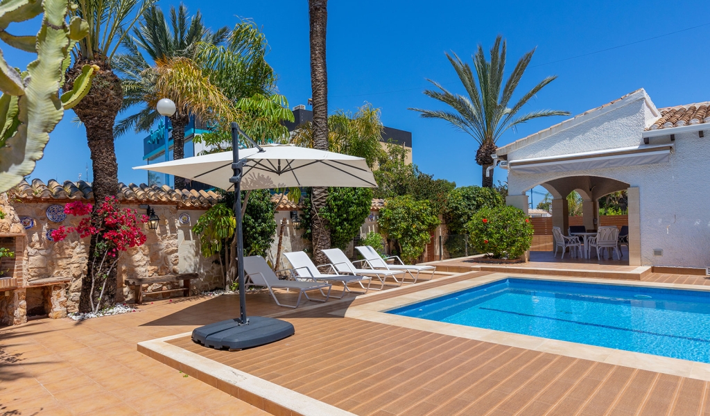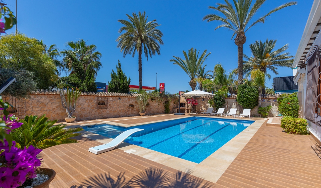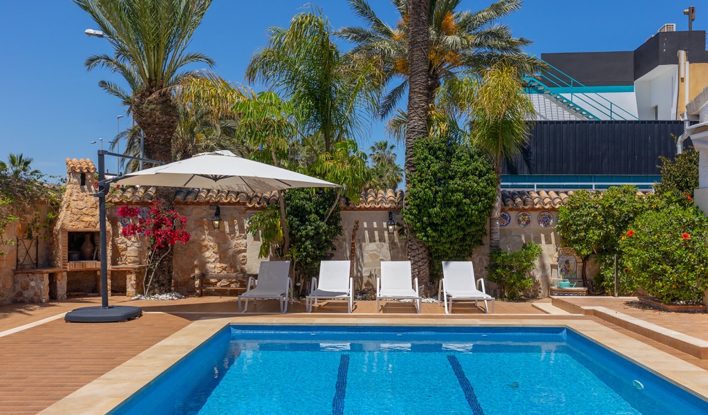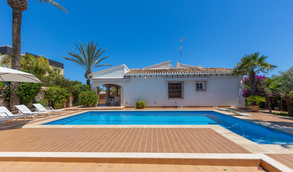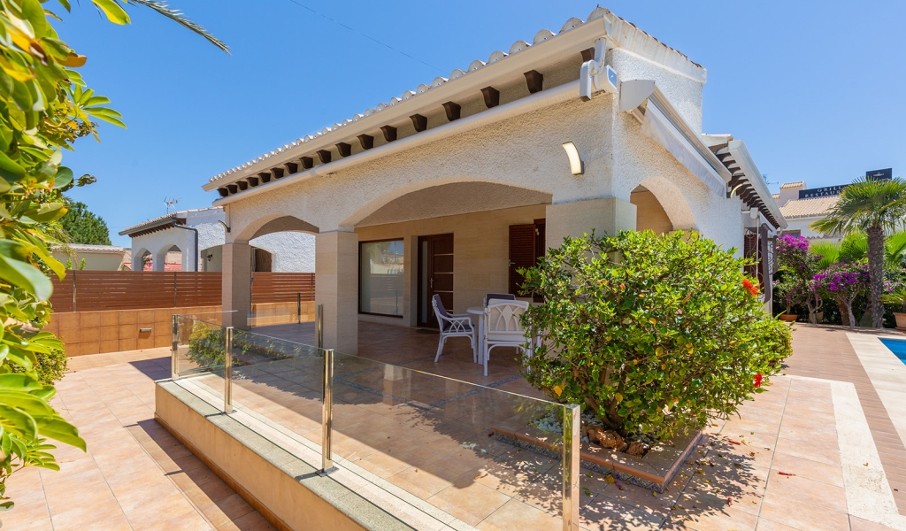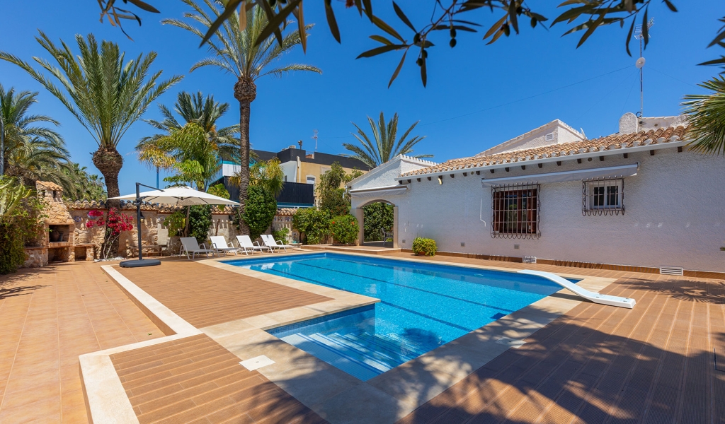 We present this charming villa located in one of the most privileged areas of the Costa Blanca: Punta Prima, just a few steps from the sea. The property has a built area of 168 m², set on a spacious 540 m² plot, offering privacy, comfort, and ample outdoor space to enjoy. The villa features 4 spacious bedrooms, 2 full bathrooms, a bright living-dining room with direct access to the exterior, and a modern fully equipped open-plan kitchen. Outside, the property boasts a private pool, barbecue area, sunny terraces, and a Mediterranean garden – ideal for enjoying the climate all year round. Punta Prima is a well-established coastal area, known for its direct access to the sea, fine sandy beaches, natural coves, and peaceful environment. All essential services are nearby: restaurants, supermarkets, pharmacies, shopping centres such as La Zenia Boulevard, and excellent road connections. Just 10 minutes by car from the centre of Torrevieja, and surrounded by golf courses, sports facilities, and green areas.