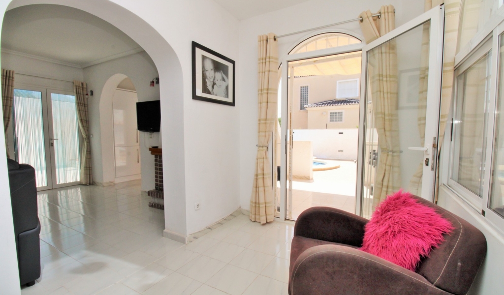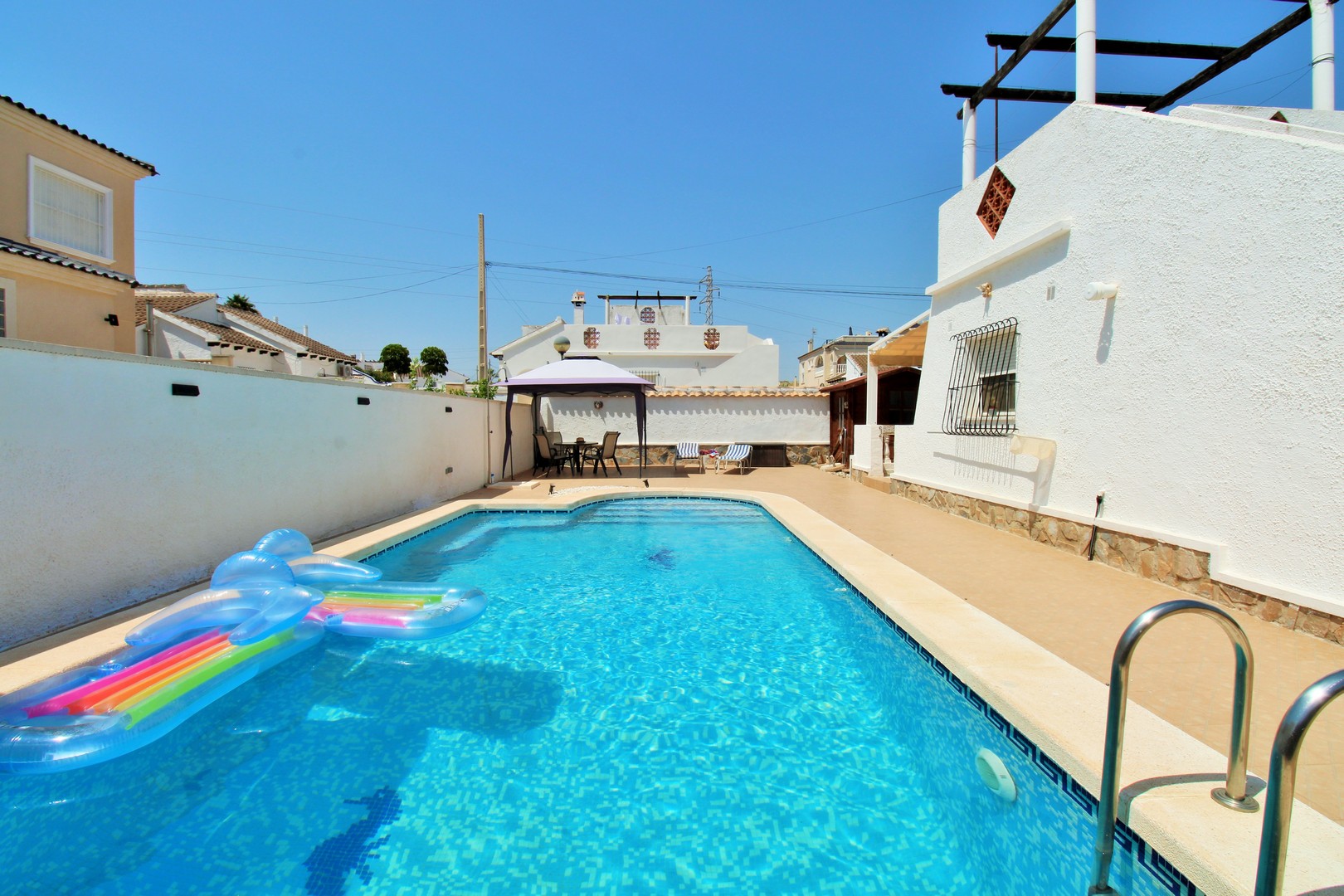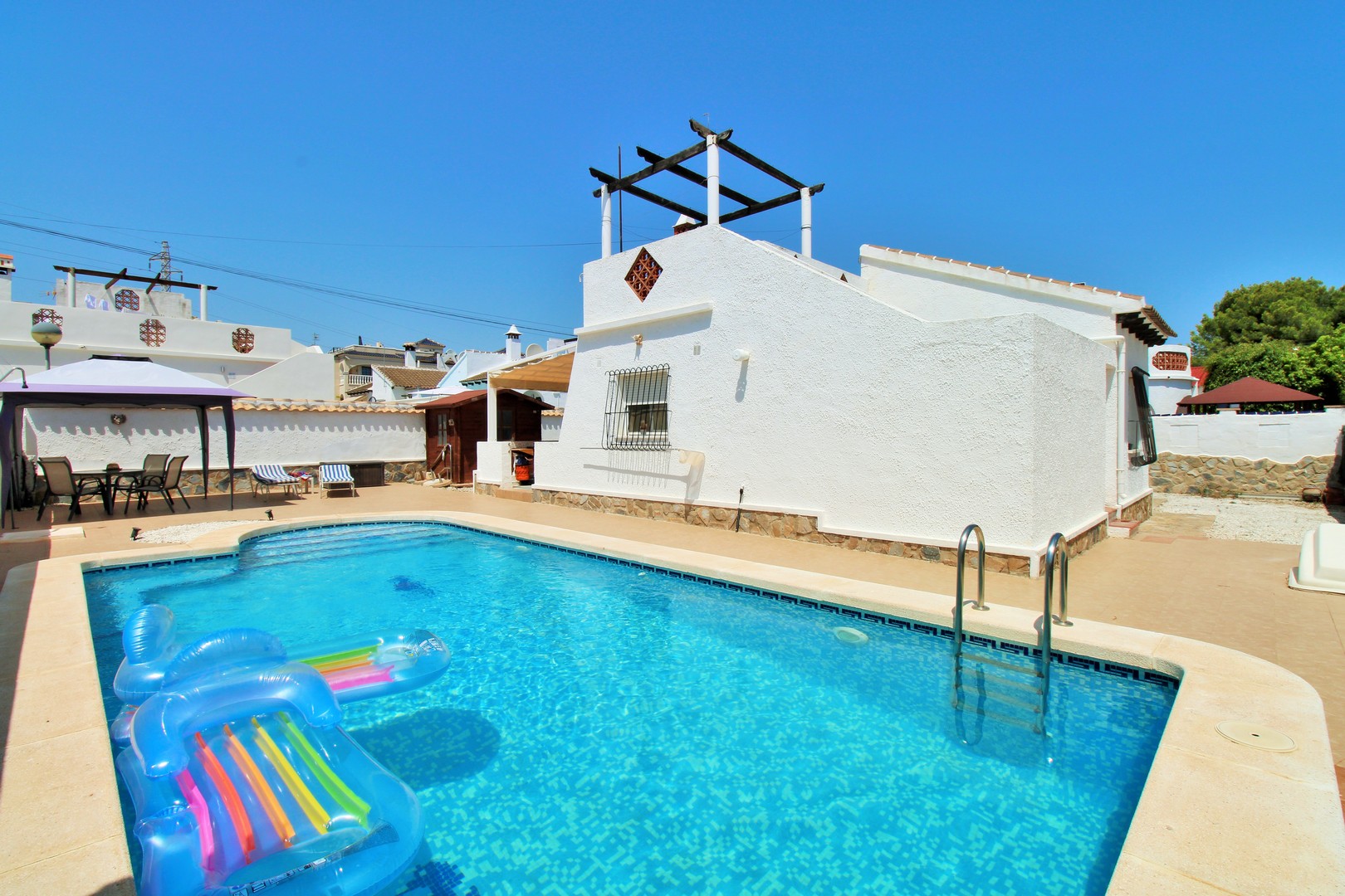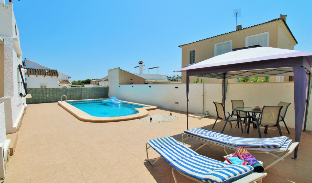 A beautifully presented three-bedroom, two-bathroom detached villa with a generous private swimming pool, set within the sought-after Eagles Nest neighbourhood, just minutes from Villamartin Plaza and its renowned golf course. Occupying a substantial 420m2 plot, the property offers extensive outdoor space designed for both relaxation and entertaining, with ample off-road parking secured by an electric gate. A short stroll brings you to local amenities, including the popular Cheers Bar and the San Miguel Bowls Club.