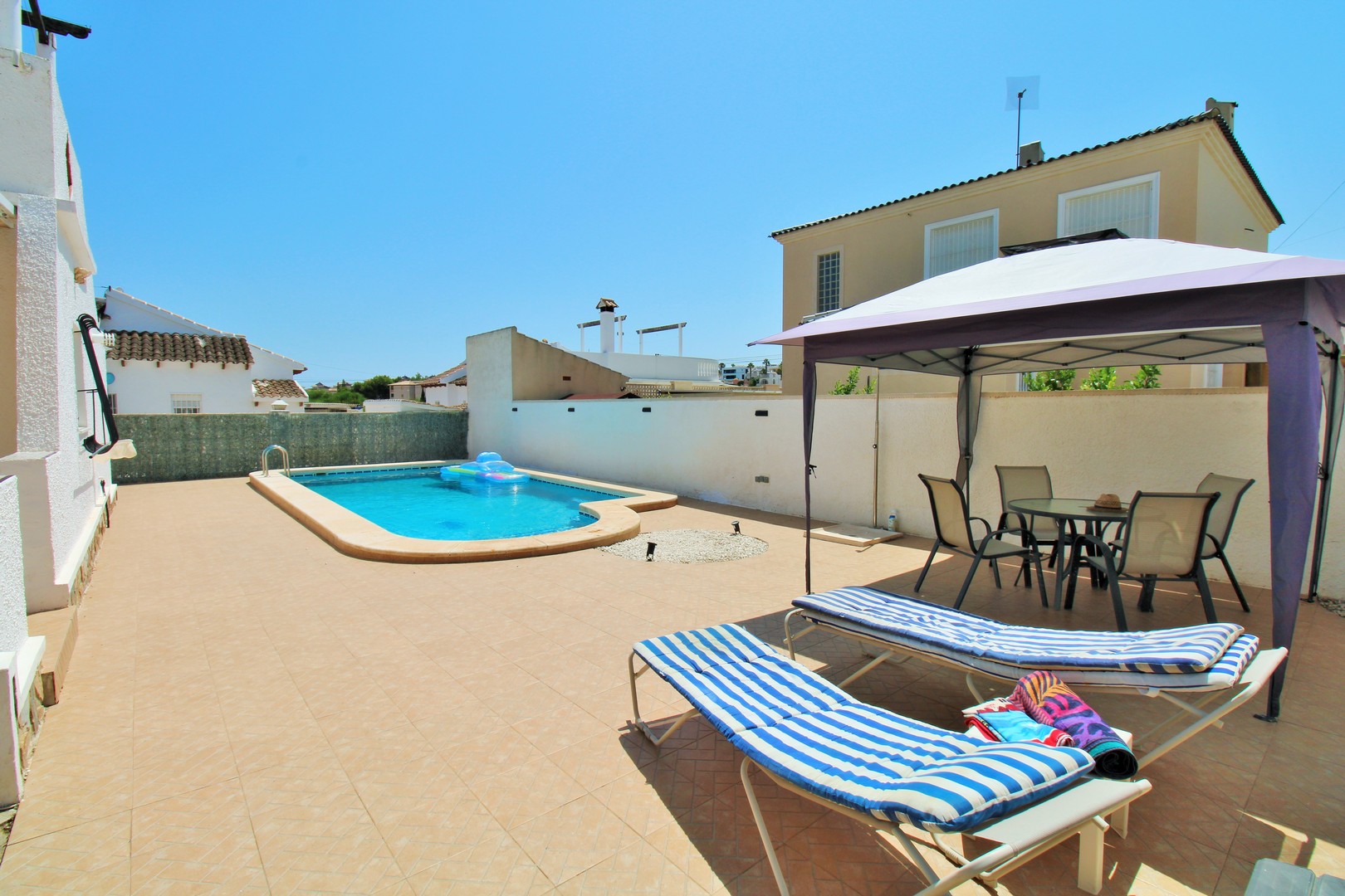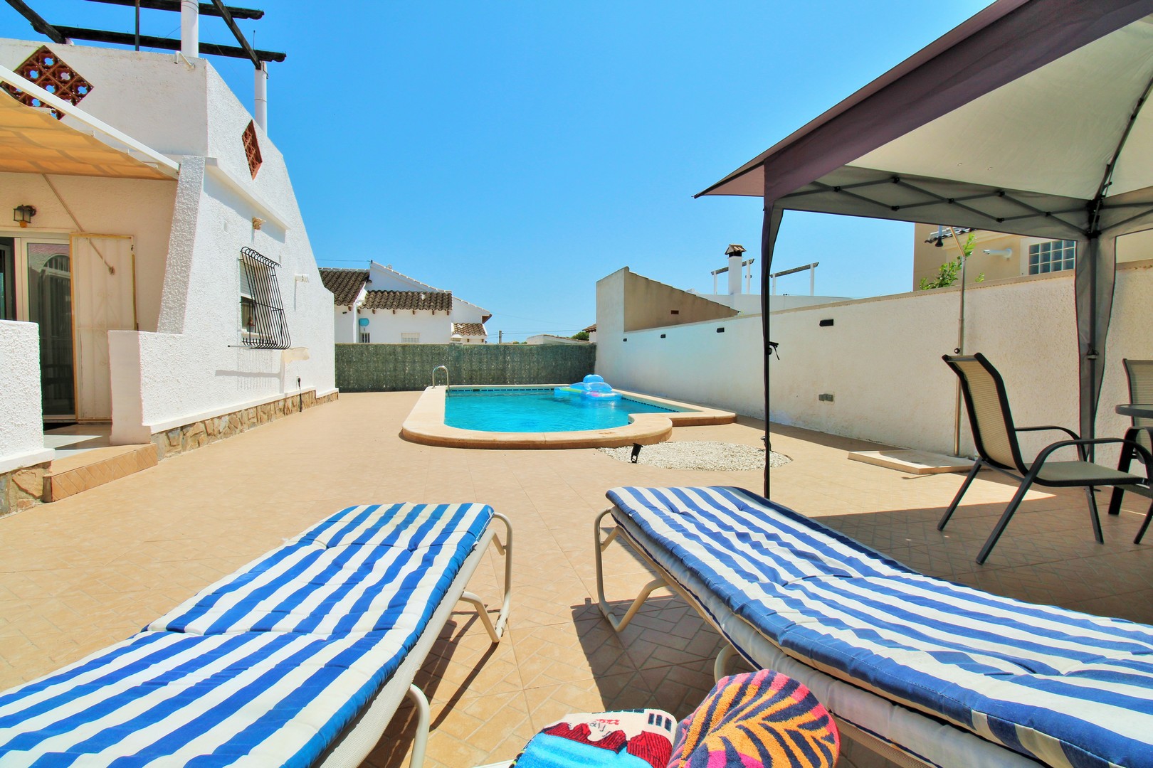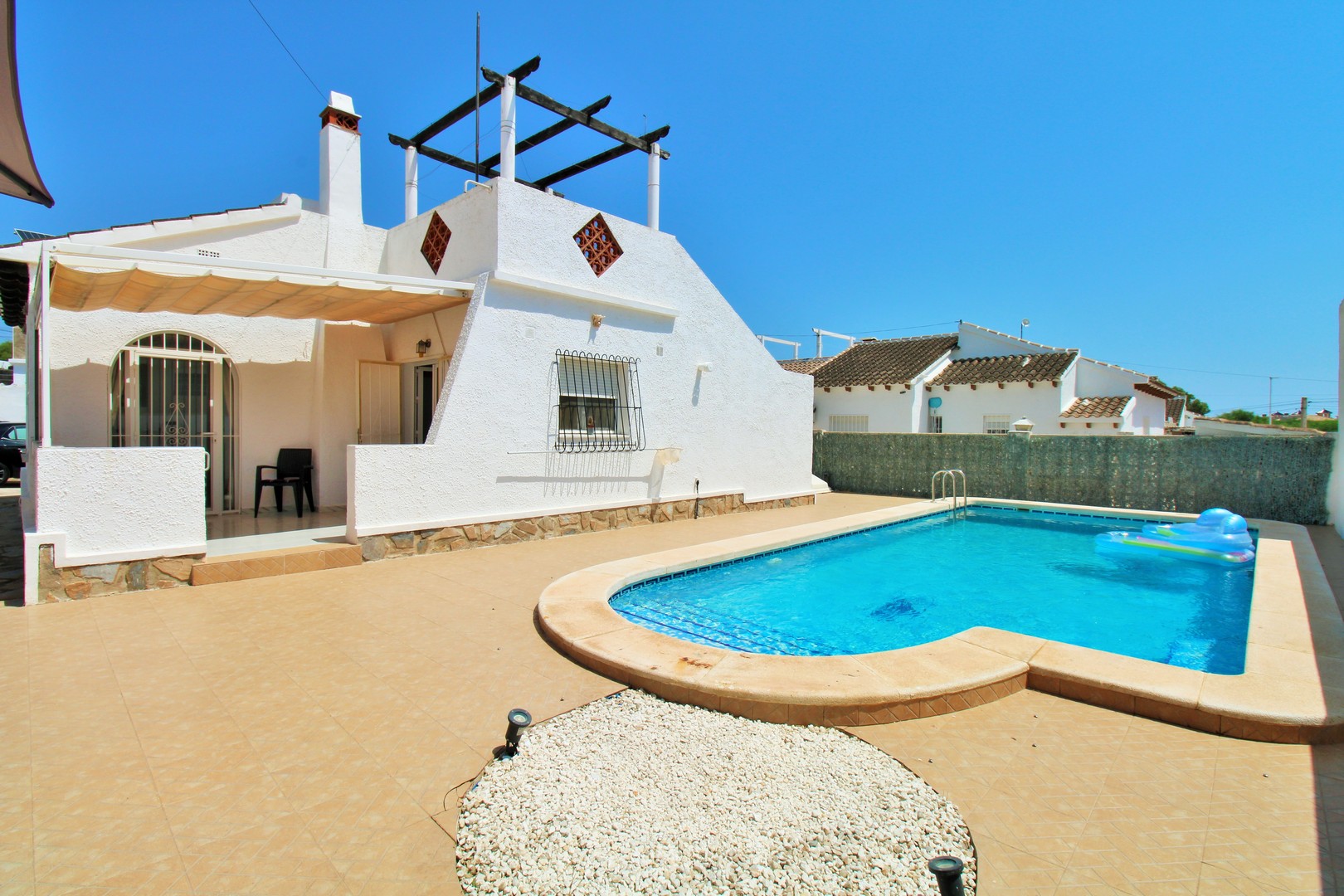 A beautifully presented three-bedroom, two-bathroom detached villa with a generous private swimming pool, set within the sought-after Eagles Nest neighbourhood, just minutes from Villamartin Plaza and its renowned golf course. Occupying a substantial 420m2 plot, the property offers extensive outdoor space designed for both relaxation and entertaining, with ample off-road parking secured by an electric gate. A short stroll brings you to local amenities, including the popular Cheers Bar and the San Miguel Bowls Club.