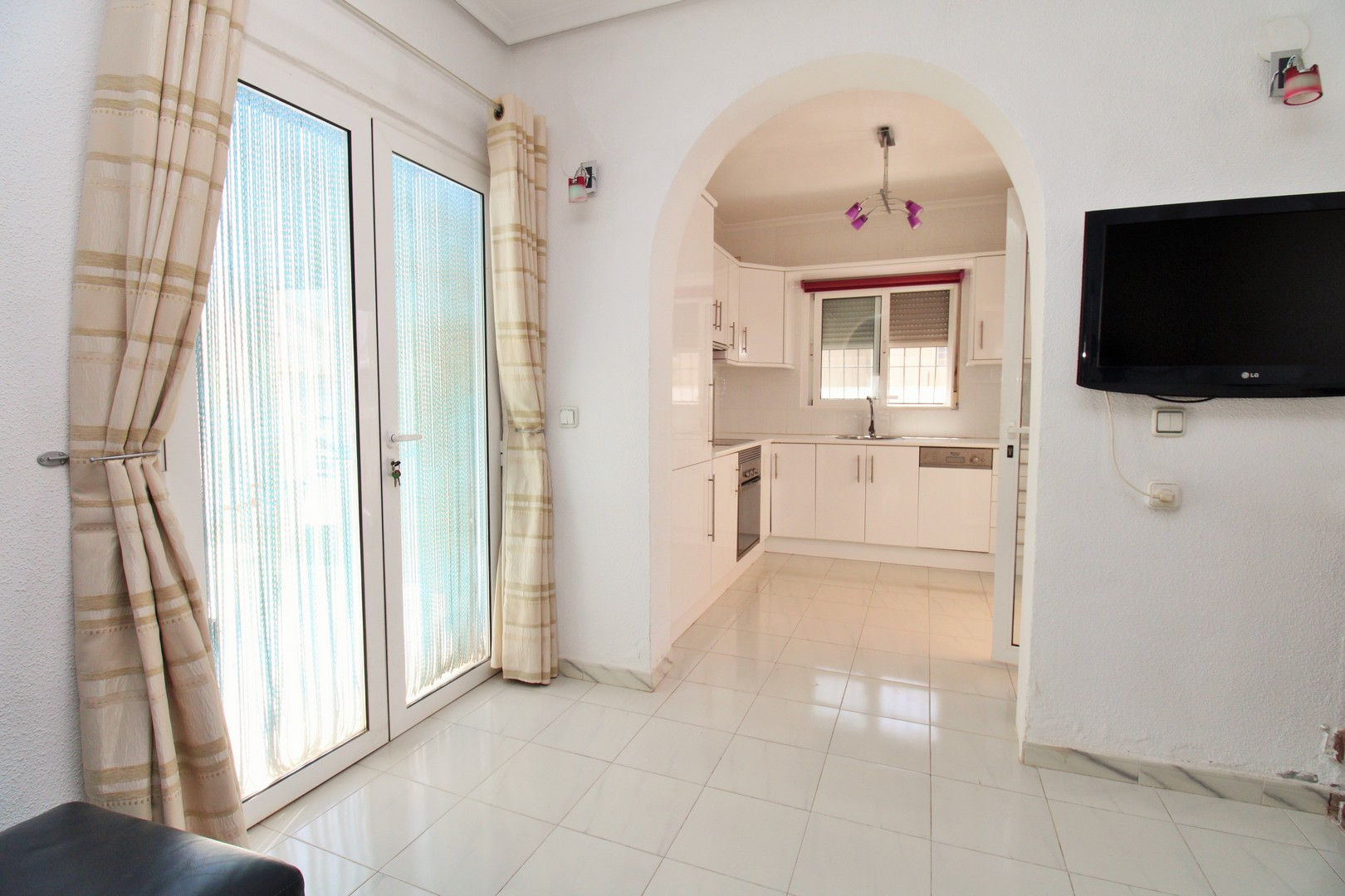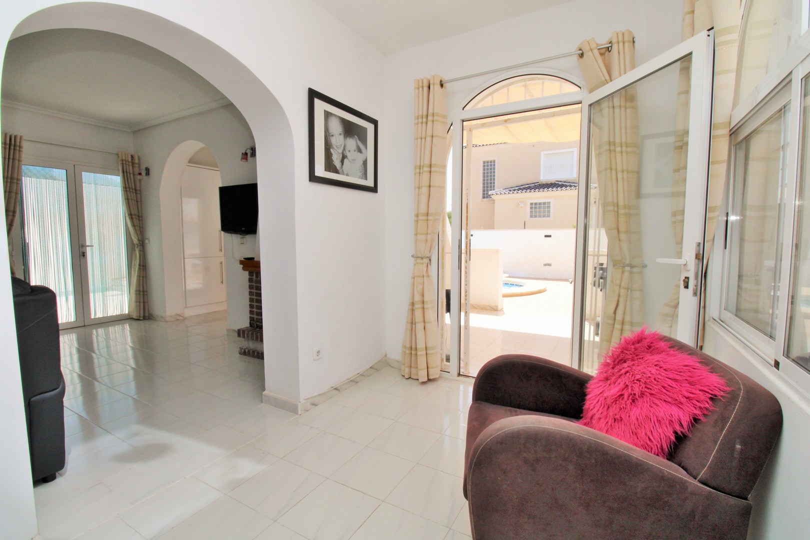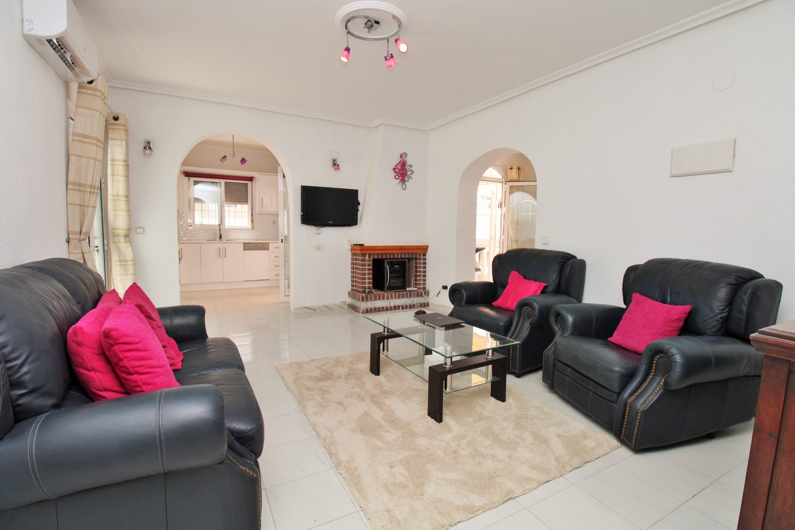 The villa’s accommodation is thoughtfully arranged across a single level. An inviting entrance terrace doubles as an outdoor dining area, leading into a spacious and light-filled living room with a feature fireplace and dining room. The modern open-plan kitchen is well-appointed with built-in appliances, and seamlessly integrates with the main living space. There are three double bedrooms, each with fitted wardrobes, and two renovated bathrooms finished to a high standard.