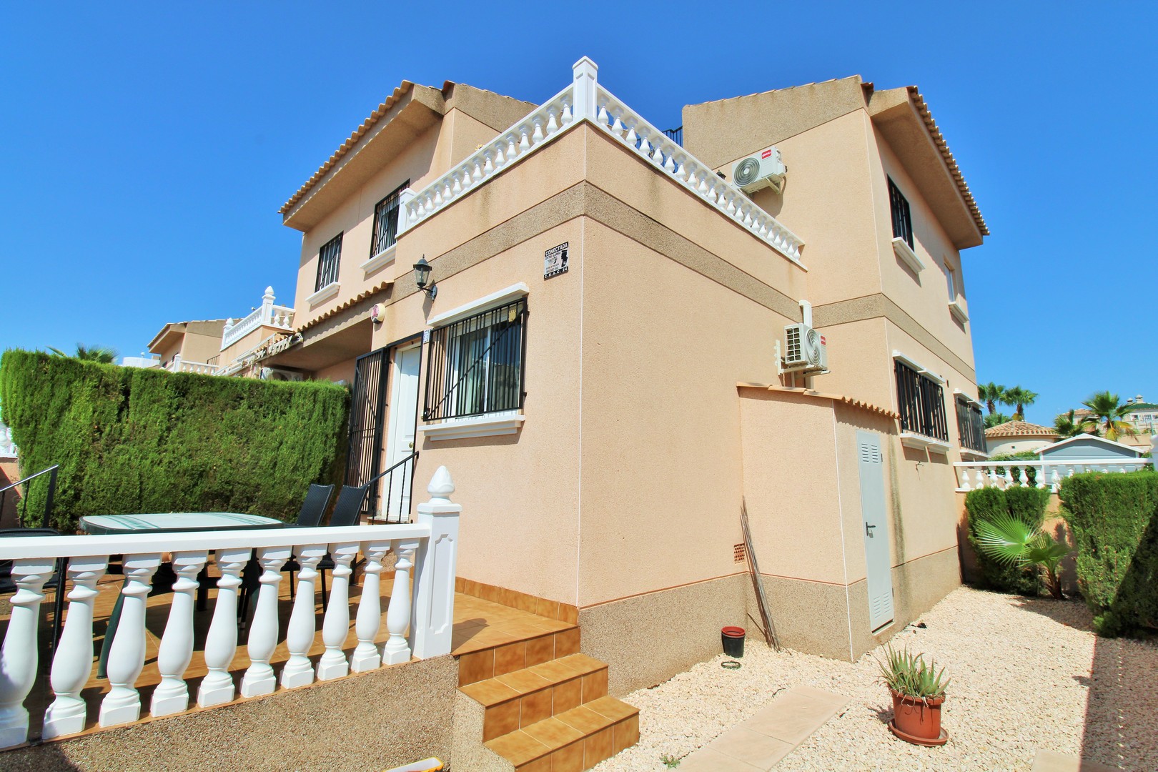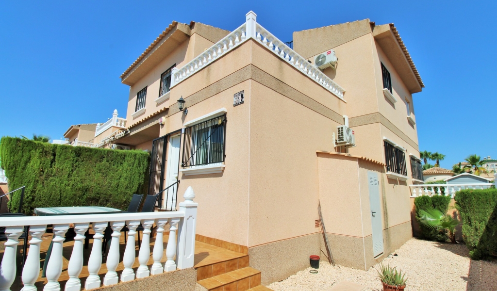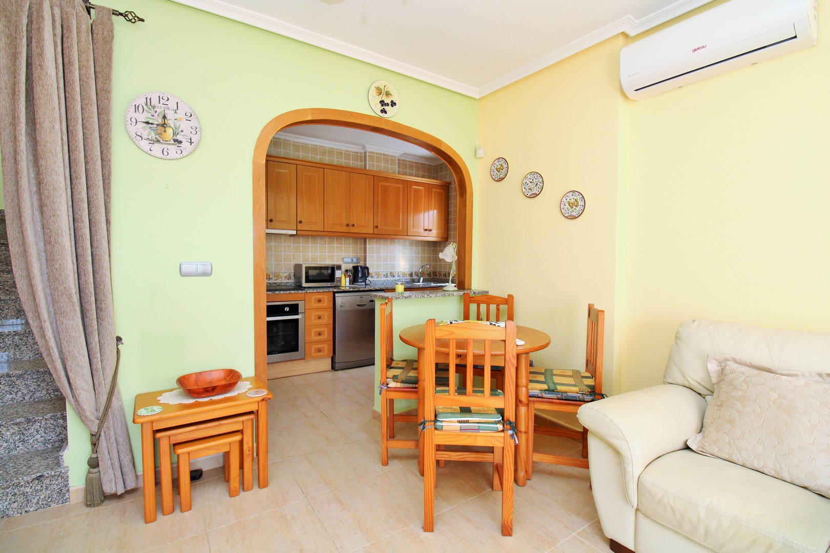 This bright and spacious three-bedroom quad house is set in the popular Pau 8 area of Villamartin, just a short walk from the renowned Villamartin Plaza and golf course. Owned by the same family since it was built, the property has been carefully maintained and enjoys a privileged position directly facing the communal pool—one of only two houses in the development with this rare outlook. Recently upgraded with brand new air-conditioning units throughout, it offers a comfortable living environment alongside excellent outdoor space.