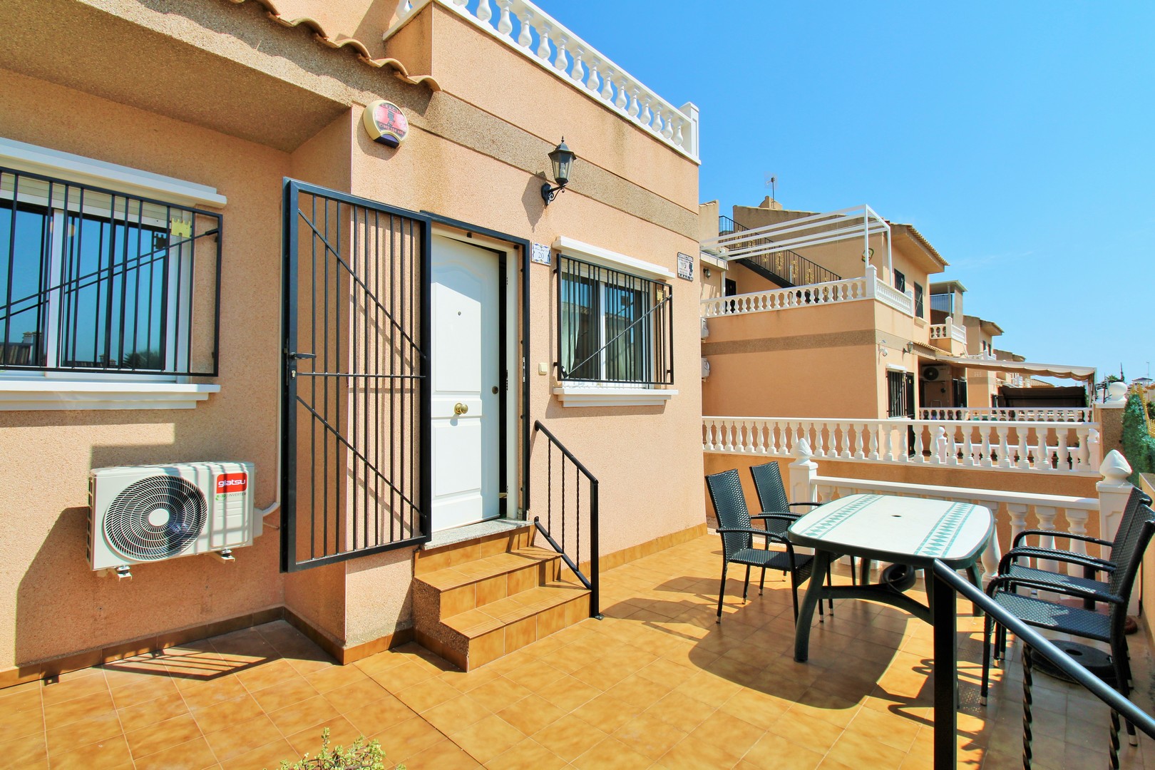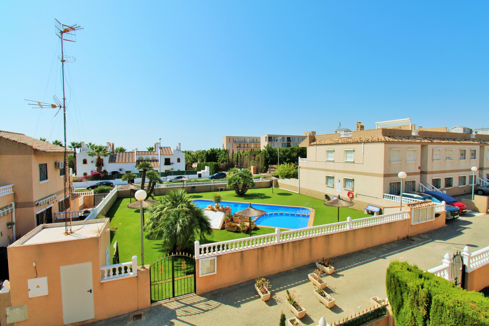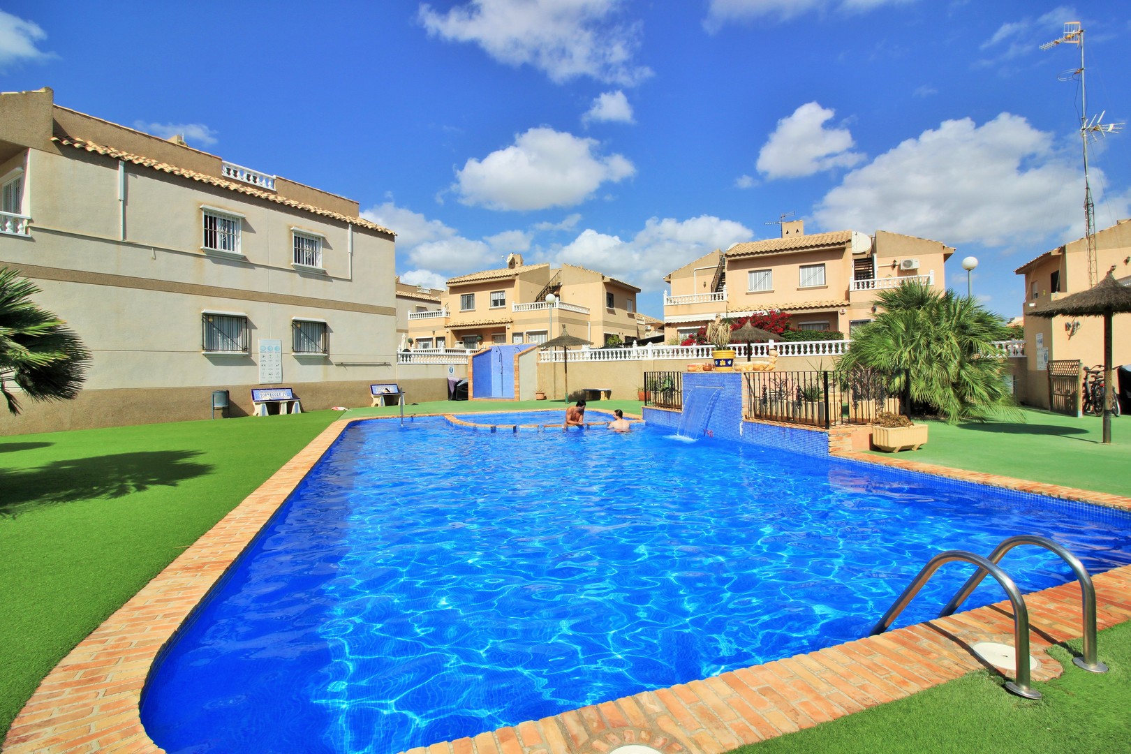 Inside, the ground floor comprises a welcoming lounge and dining area with an open-plan kitchen and adjoining utility space, one double bedroom, a bathroom with walk-in shower, and a handy under-stairs storage cupboard. Upstairs, you’ll find two further double bedrooms with fitted wardrobes, a family bathroom, and access to a sunny balcony leading up to the rooftop solarium, with views across the pool area. The property is sold furnished, including white goods and new A/C units, and forms part of a well-kept community with a beautiful communal pool just steps away.