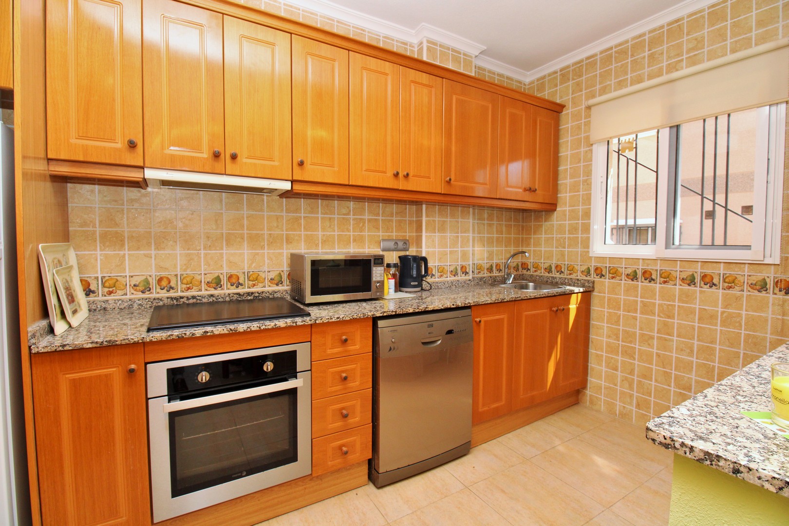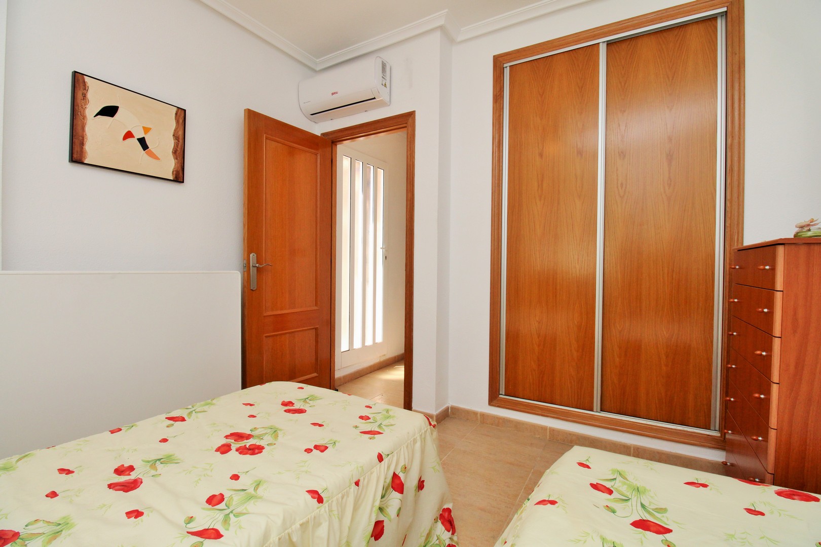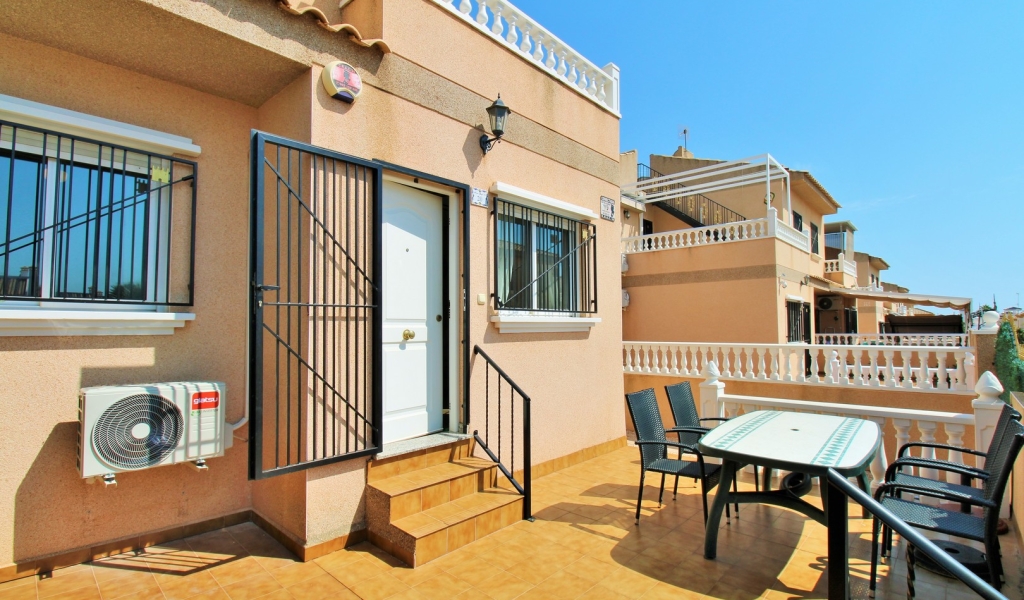 Inside, the ground floor comprises a welcoming lounge and dining area with an open-plan kitchen and adjoining utility space, one double bedroom, a bathroom with walk-in shower, and a handy under-stairs storage cupboard. Upstairs, you’ll find two further double bedrooms with fitted wardrobes, a family bathroom, and access to a sunny balcony leading up to the rooftop solarium, with views across the pool area. The property is sold furnished, including white goods and new A/C units, and forms part of a well-kept community with a beautiful communal pool just steps away.