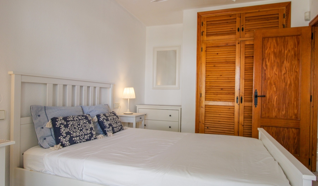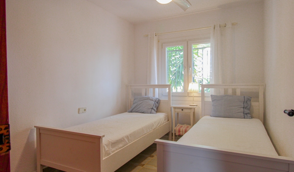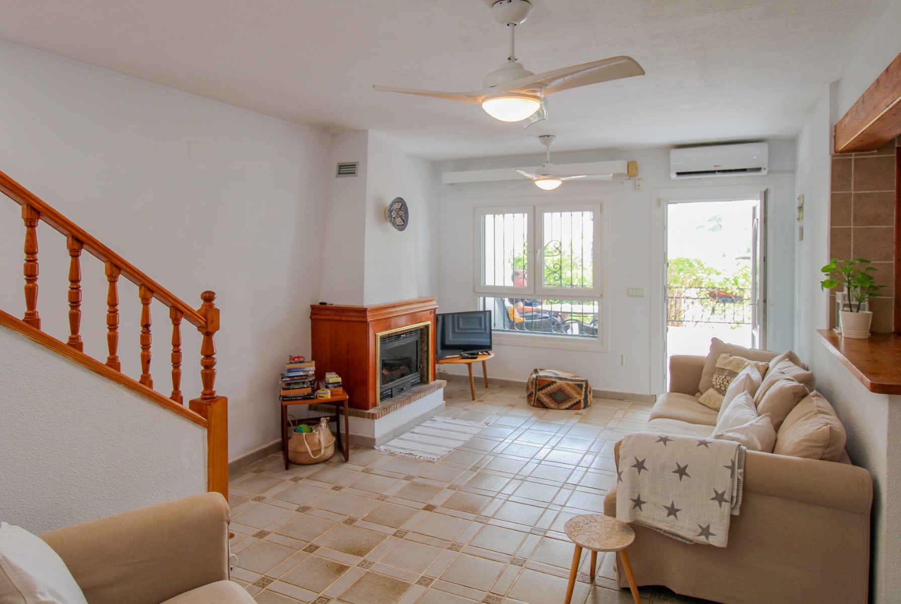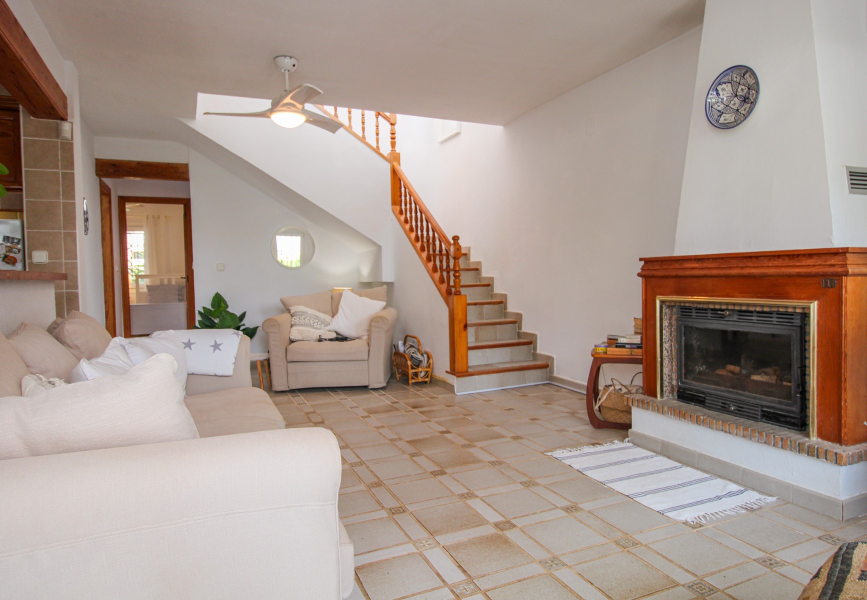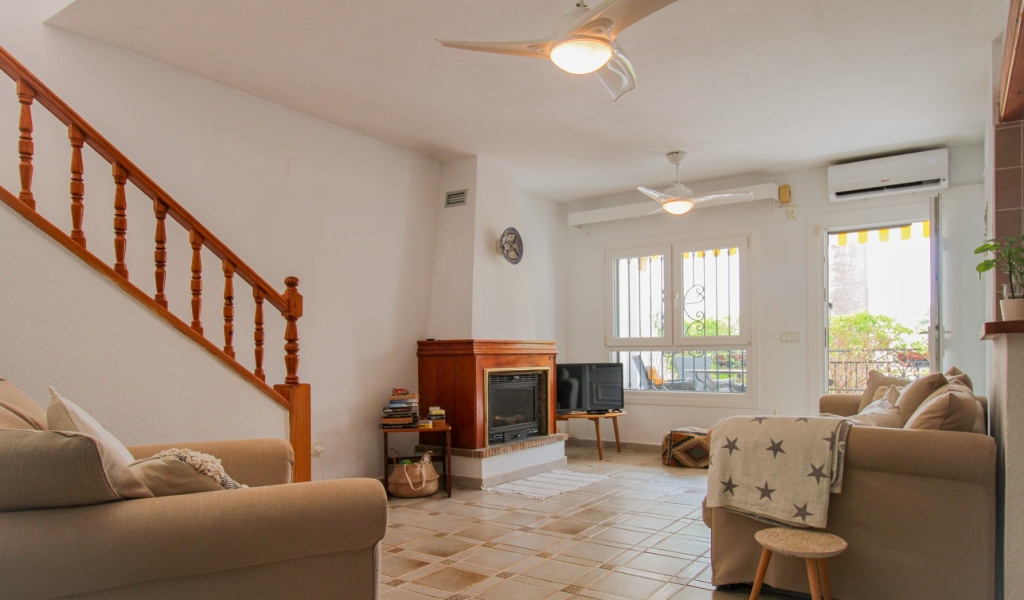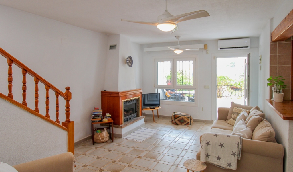 The property boasts spacious front and rear terraces with open views over the lush green areas, ideal for relaxing, entertaining, or enjoying the Mediterranean sunshine. Inside, you’ll find a welcoming lounge and dining area with a cosy fireplace, complemented by air conditioning and ceiling fans for comfortable living all year round. The home has been thoughtfully decorated, blending modern touches with the charm of traditional Spanish style. The layout comprises: 2 double bedrooms on the ground floor, both with fitted wardrobes, plus a family bathroom. On the upper level, the master suite enjoys an en-suite bathroom and access to a private terrace overlooking the pool.