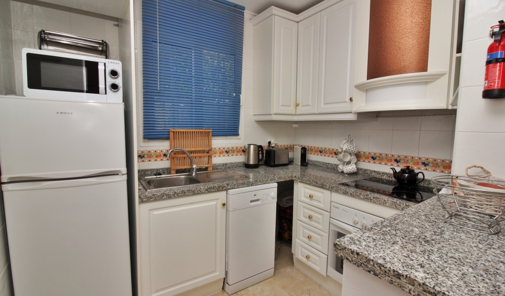 2 bedroom South facing ground floor apartment with a large sunny 121m2 garden in R22, Los Dolses, just a 15 minutes' walk from the Los Dolses commercial centre. The apartment is sold furnished with beautiful marble flooring throughout, and has a valid tourist licence in place for short term rentals, which can take several months to obtain. Another great benefit is that the property already has community permission to build a private pool, extension of the terrace by approximately one metre, plus the construction of a storage room.